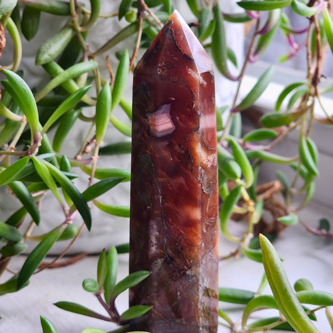 Bring joy and balance into your space with this stunning Crazy Lace Agate Tower. Measuring 3.5 inches tall and weighing 66g, this tower features vibrant swirls of red, orange, and earthy browns, complemented by intricate lace-like banding. A true statement piece, it embodies the grounding yet uplifting energy that Crazy Lace Agate is known for.