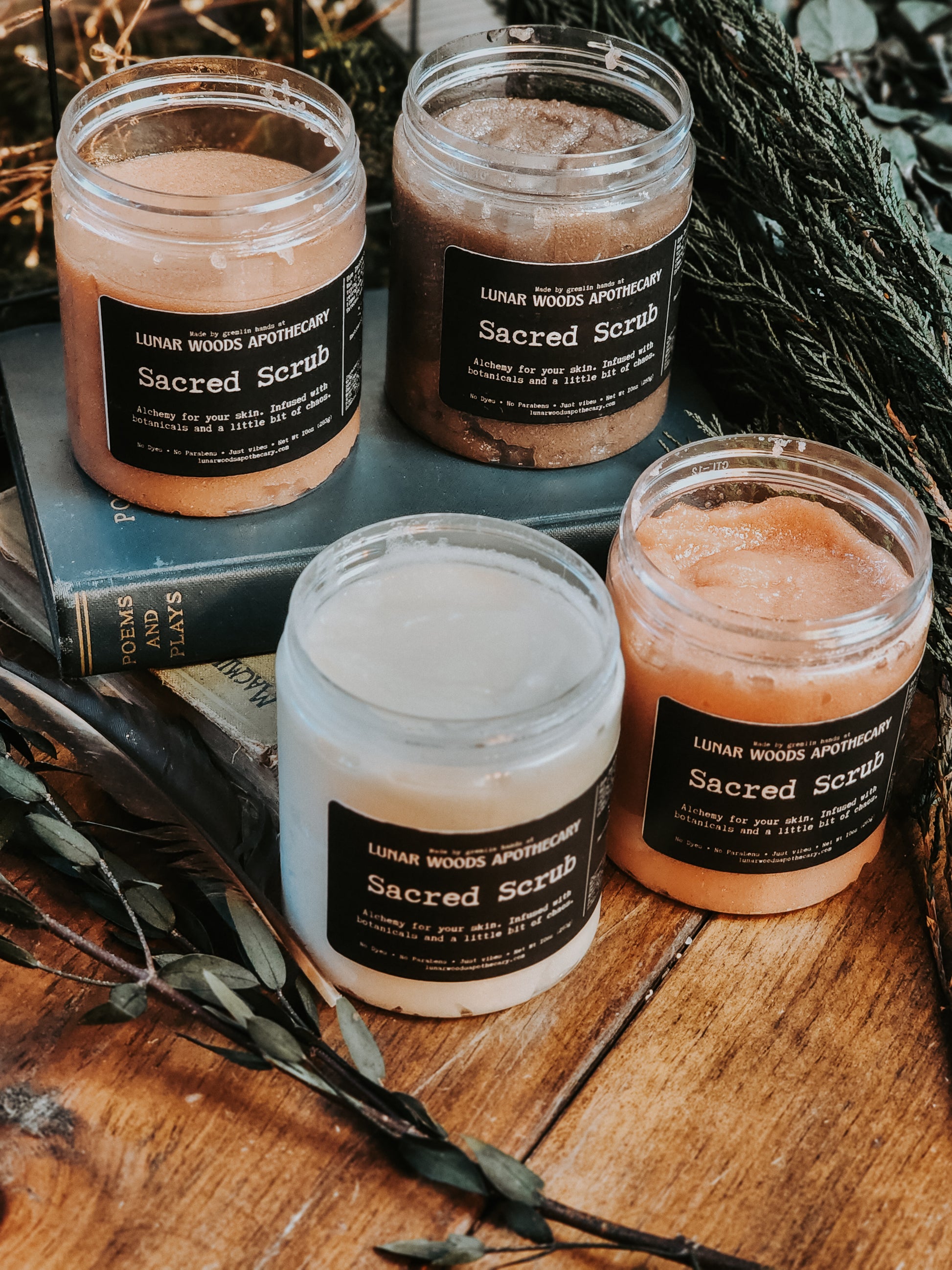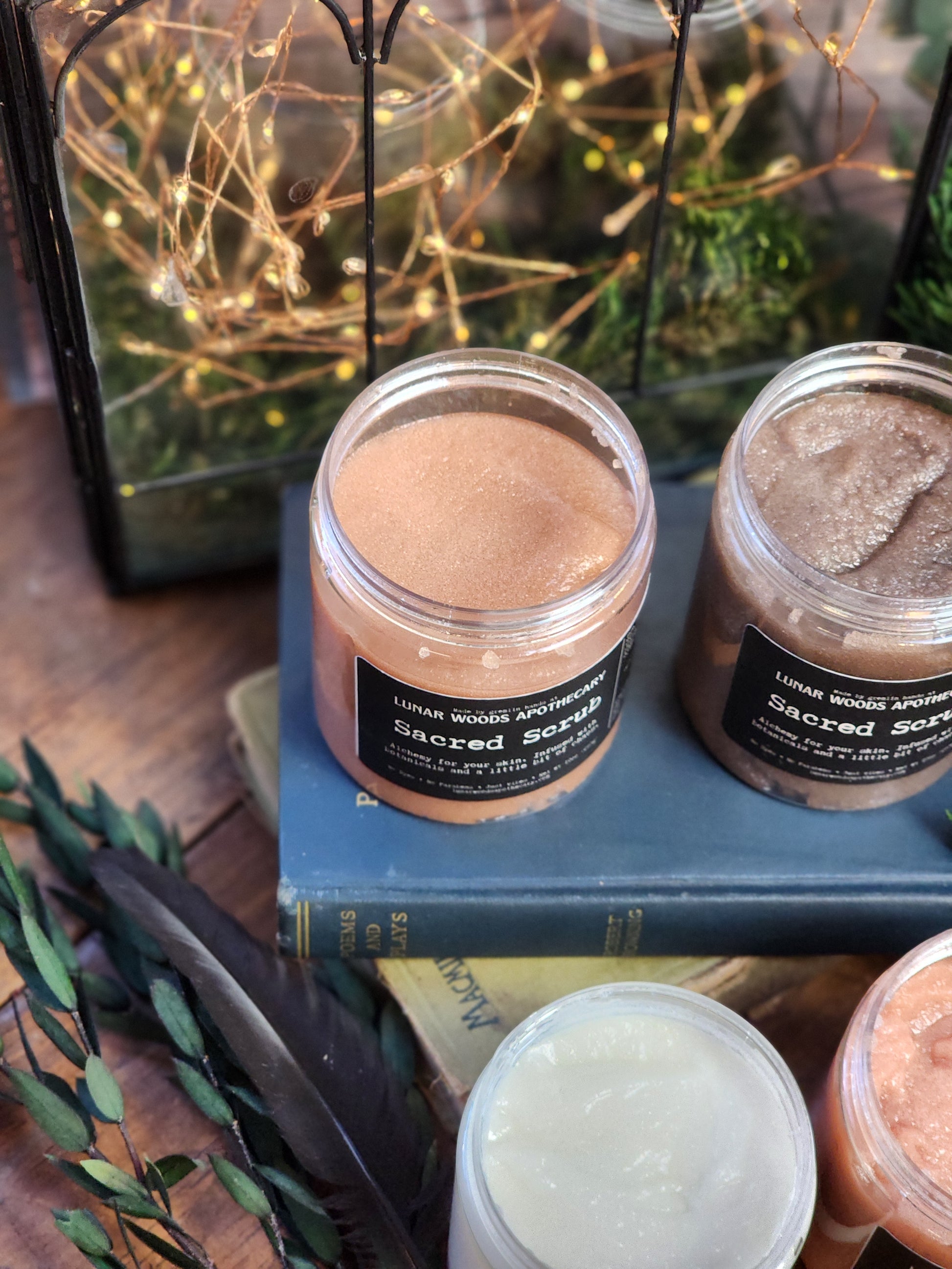 Our Sacred Scrub gently exfoliates, deeply moisturizes, and leaves your skin feeling ridiculously soft. Crafted in small batches with a nourishing base of coconut oil, sunflower oil, olive oil, and shea butter—then boosted with vitamin E and a carefully chosen blend of essential oils or certified clean fragrance oils and botanicals.