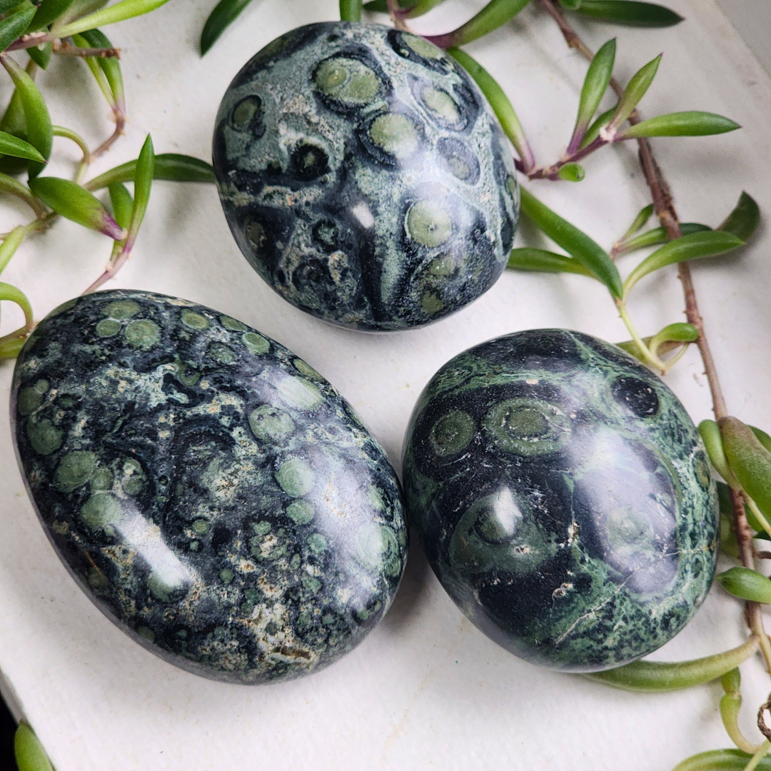 Each Kambaba Jasper Palm Stone is a one-of-a-kind piece, featuring pronounced green and grey orbicular patterns that resemble the beauty of natural landscapes. Whether you're adding it to your crystal collection or gifting it to someone seeking emotional peace and stability, this palm stone is a perfect companion for grounding and inner growth.