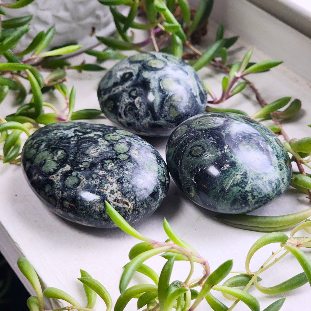 Experience the ancient, earthy energy of the Kambaba Jasper Palm Stone, known for its deep green and grey swirling patterns that are both captivating and calming. This palm stone is a powerful ally for those seeking balance, peace, and a deeper connection to nature. The pronounced circular or orbicular patterns symbolize harmony and spiritual growth, making this stone perfect for grounding and emotional stability.