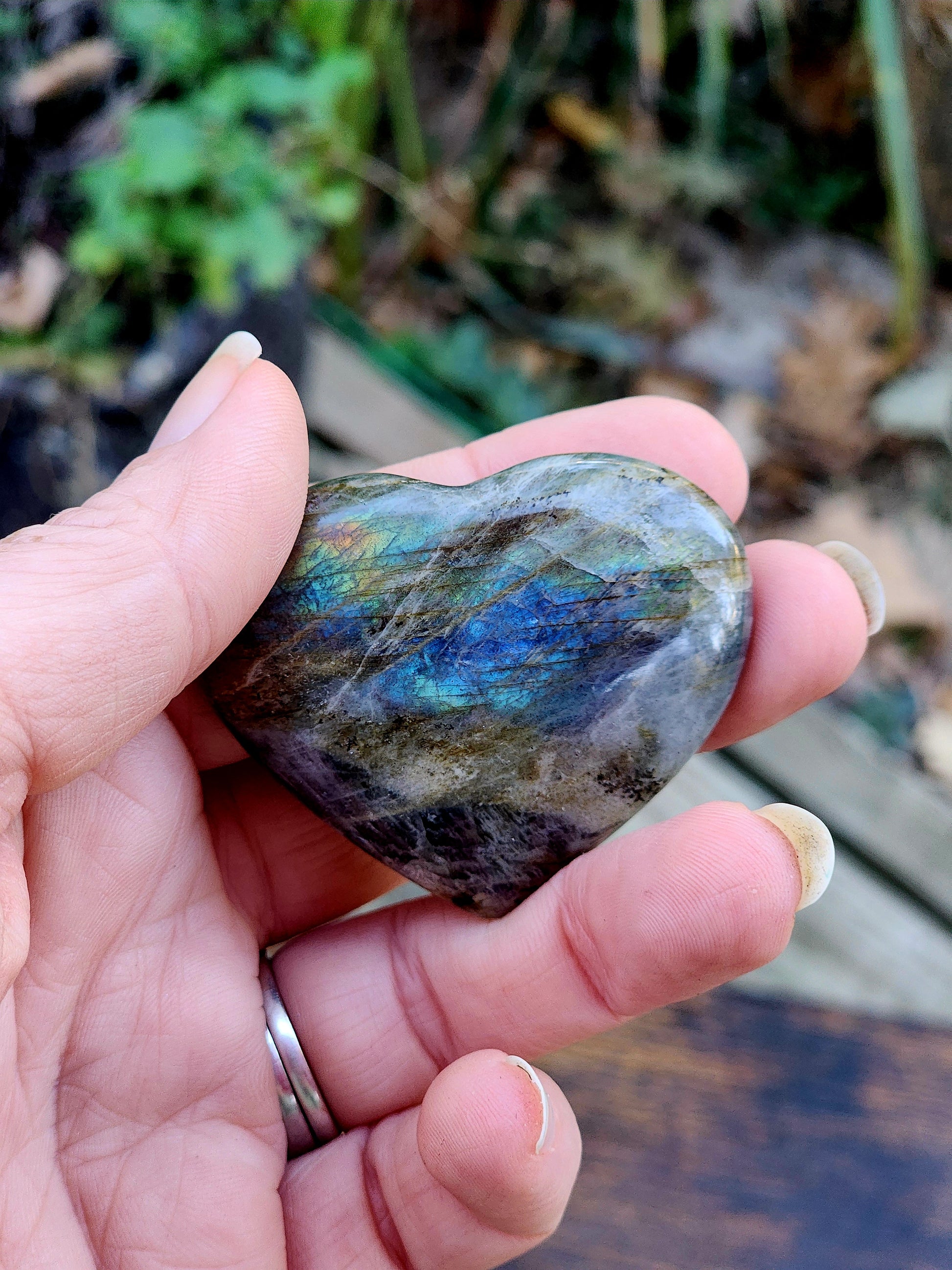 - Meditation: Hold the Labradorite heart during meditation to enhance your intuition, open your third eye chakra, and connect with higher realms. Its energy helps quiet the mind and deepen spiritual awareness.