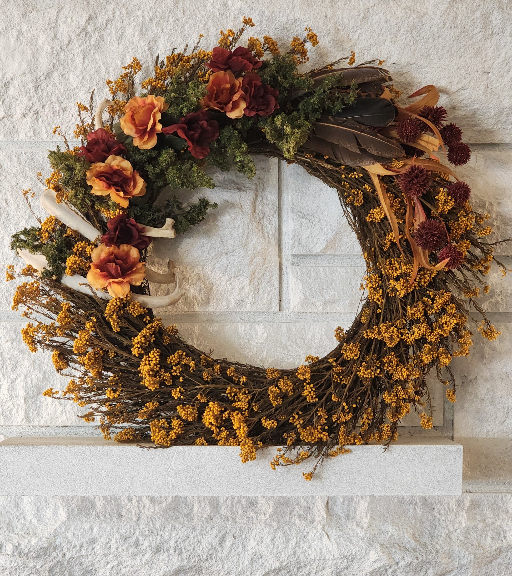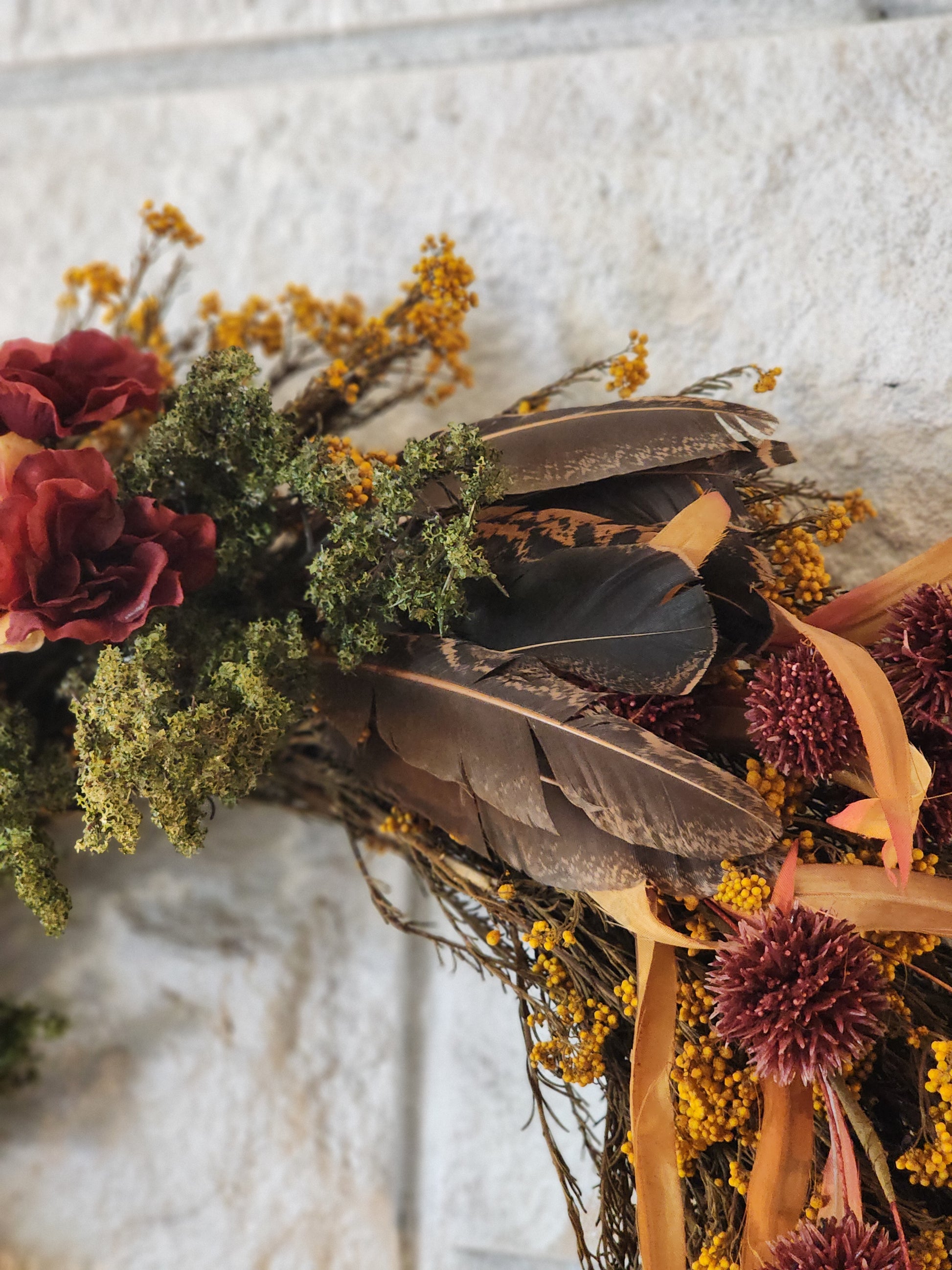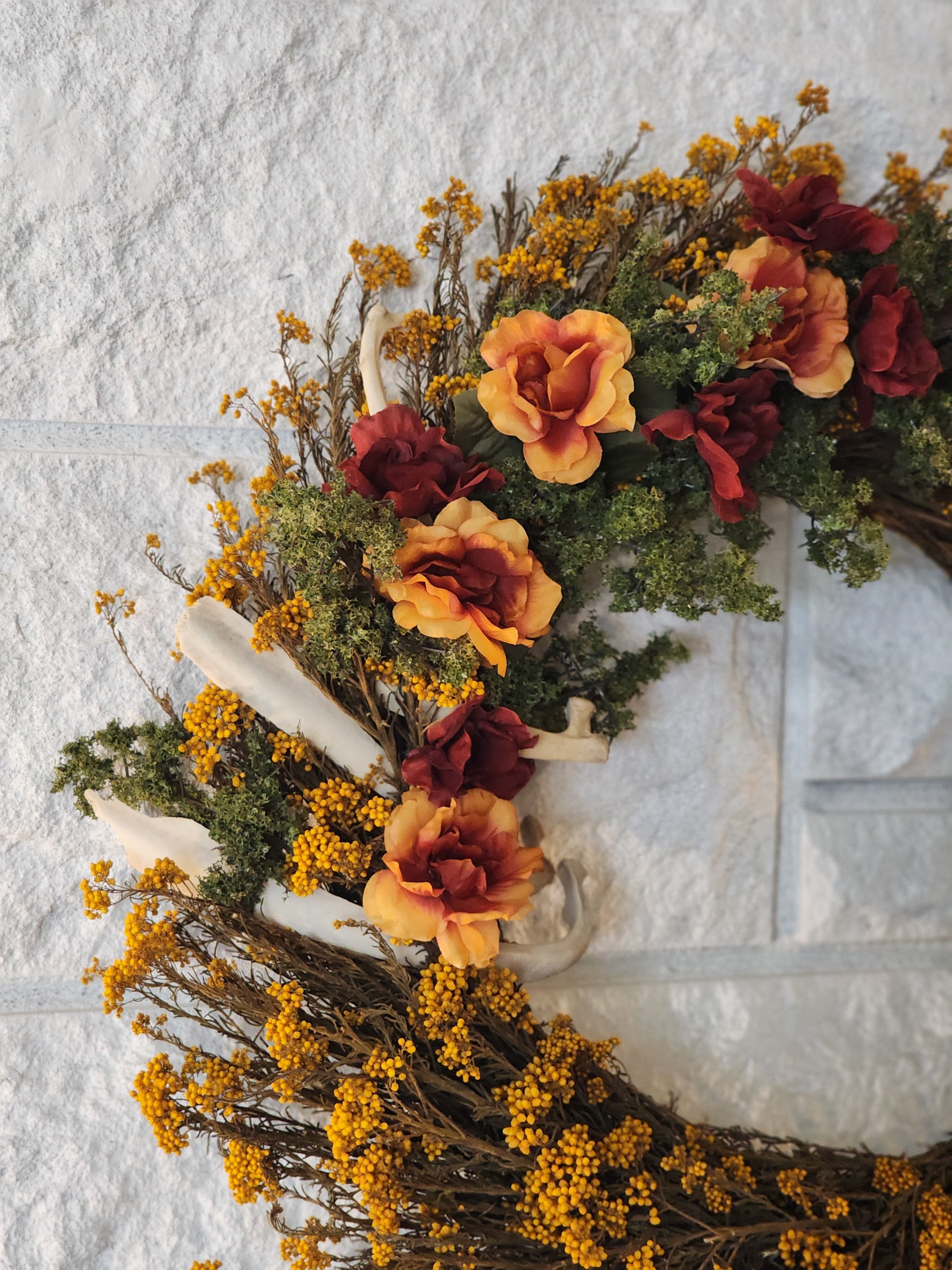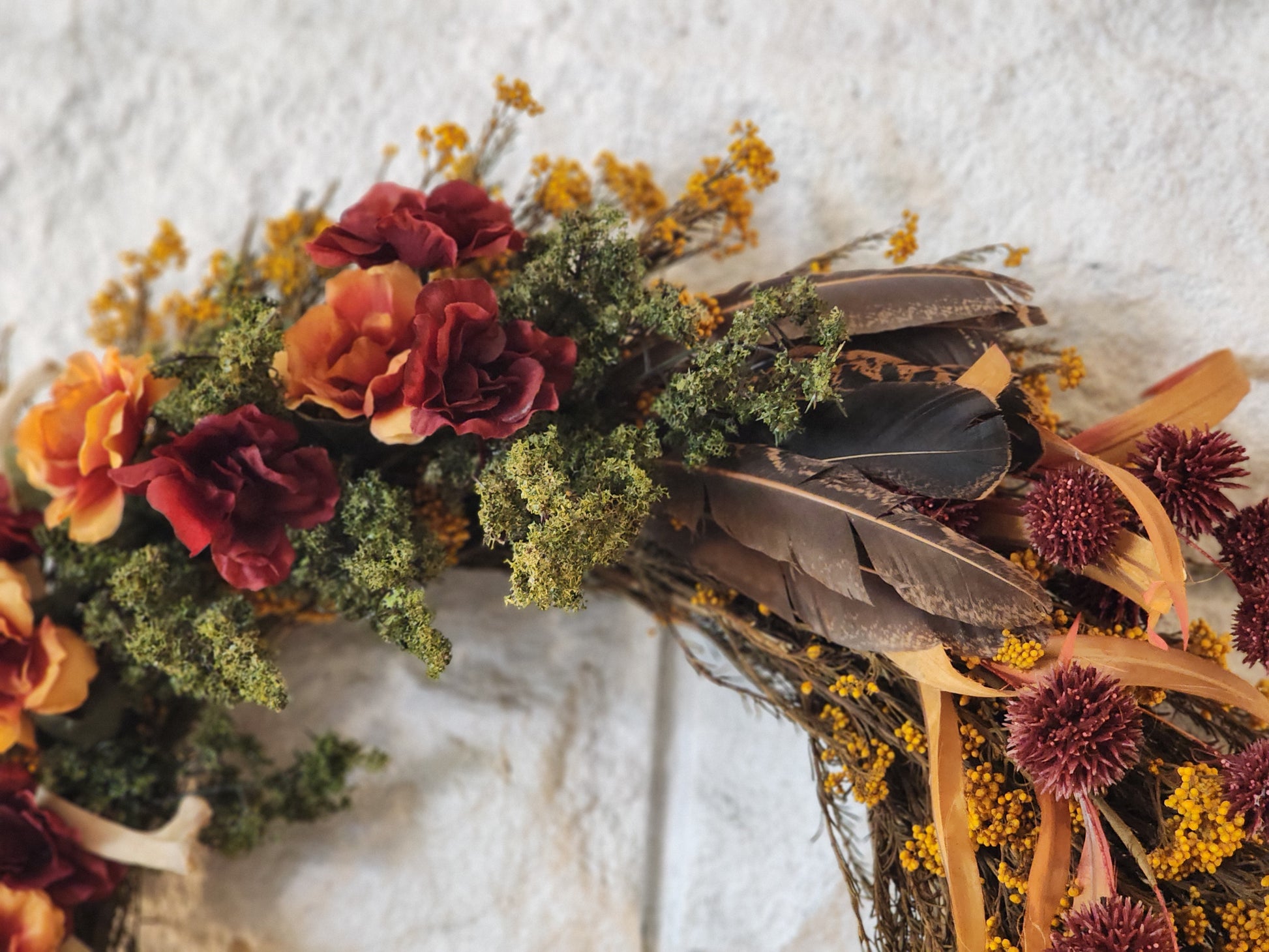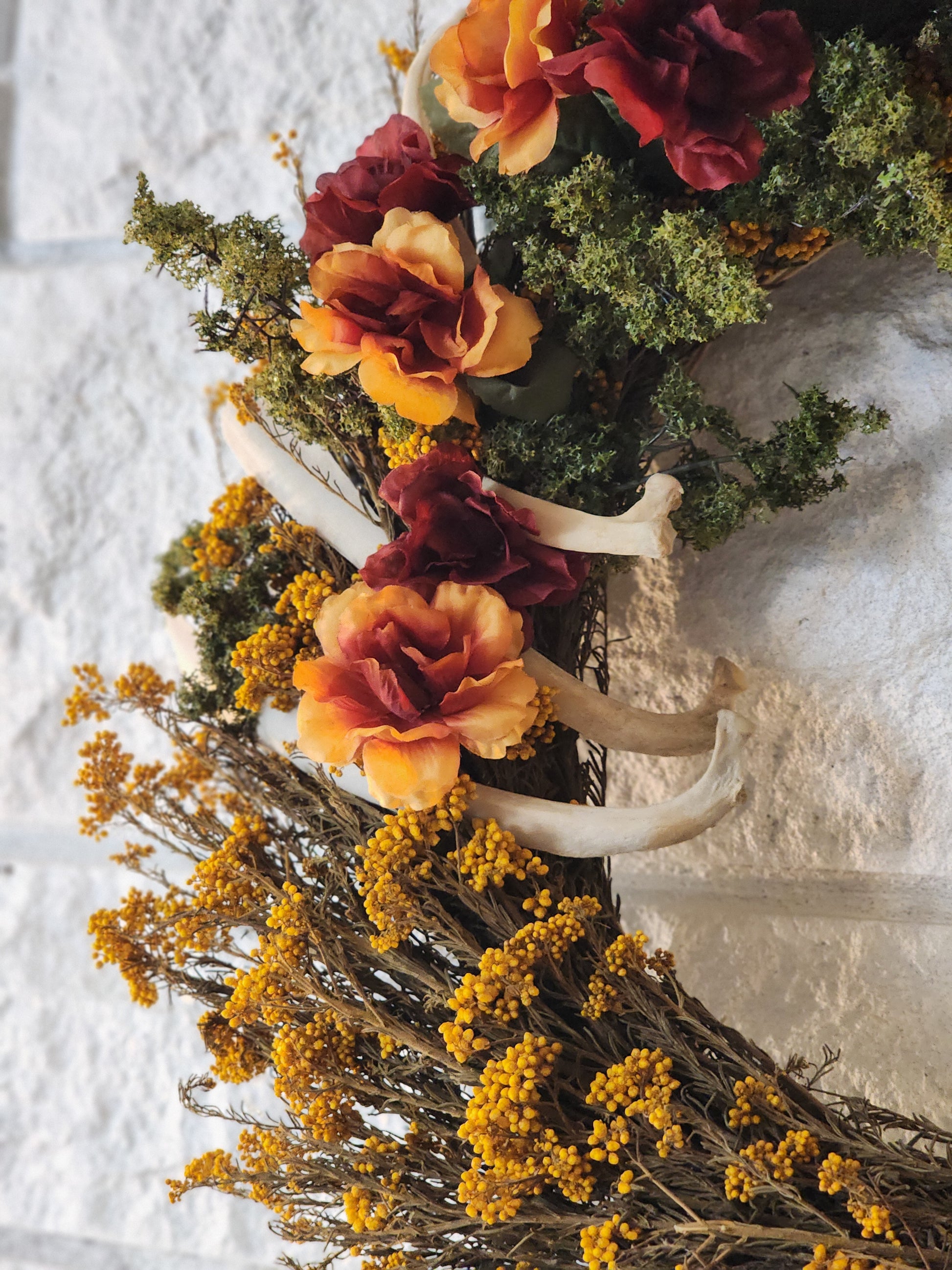 This design blends warm harvest hues, preserved moss, natural feathers, dried botanicals, and ethically sourced animal bones to create a wreath that feels like it was reclaimed by the wilds and brought home by a hearth witch.