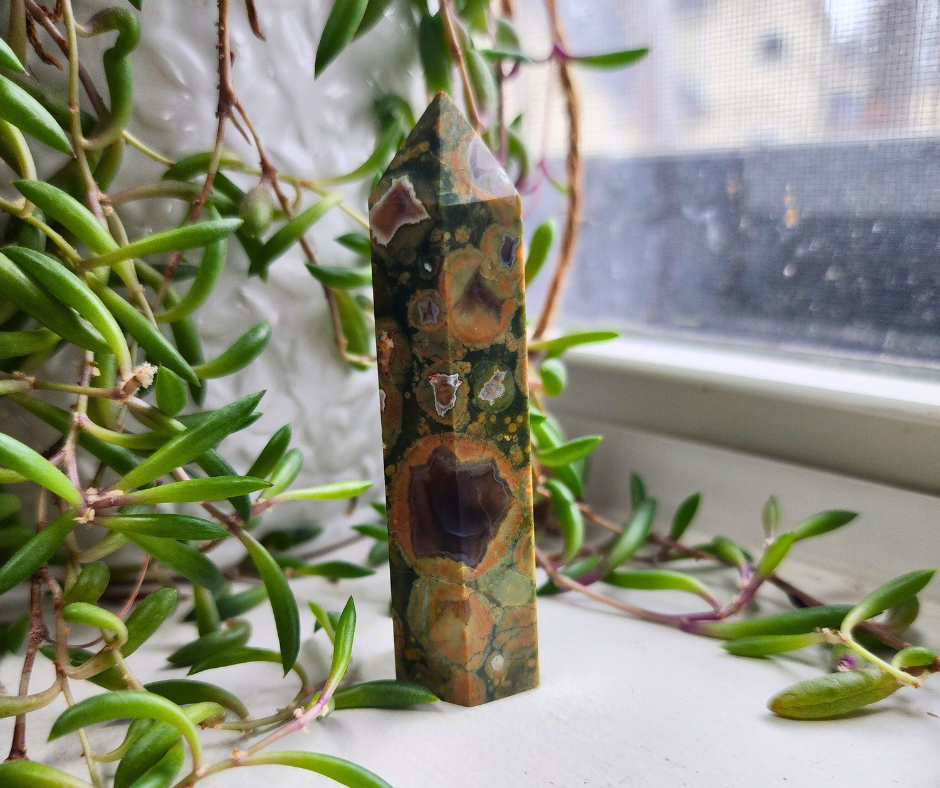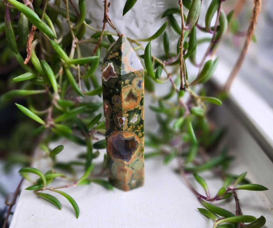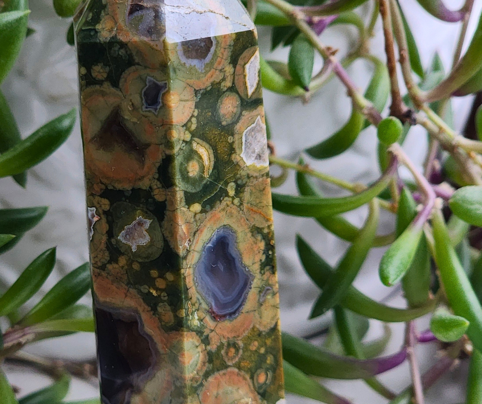 Bring the beauty of the ocean to your space with this stunning Ocean Jasper Tower, standing 3.5 inches tall and weighing 68g. Its intricate orb-like patterns in hues of green, orange, yellow, and white, paired with occasional sparkling druzy pockets, make this piece truly one-of-a-kind. Ocean Jasper is celebrated for its uplifting energy and connection to the natural world, making it a perfect addition to any crystal collection.