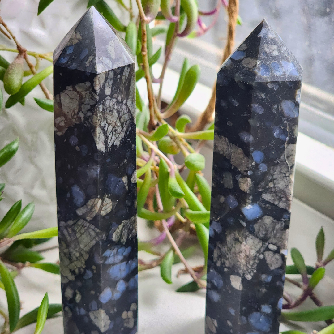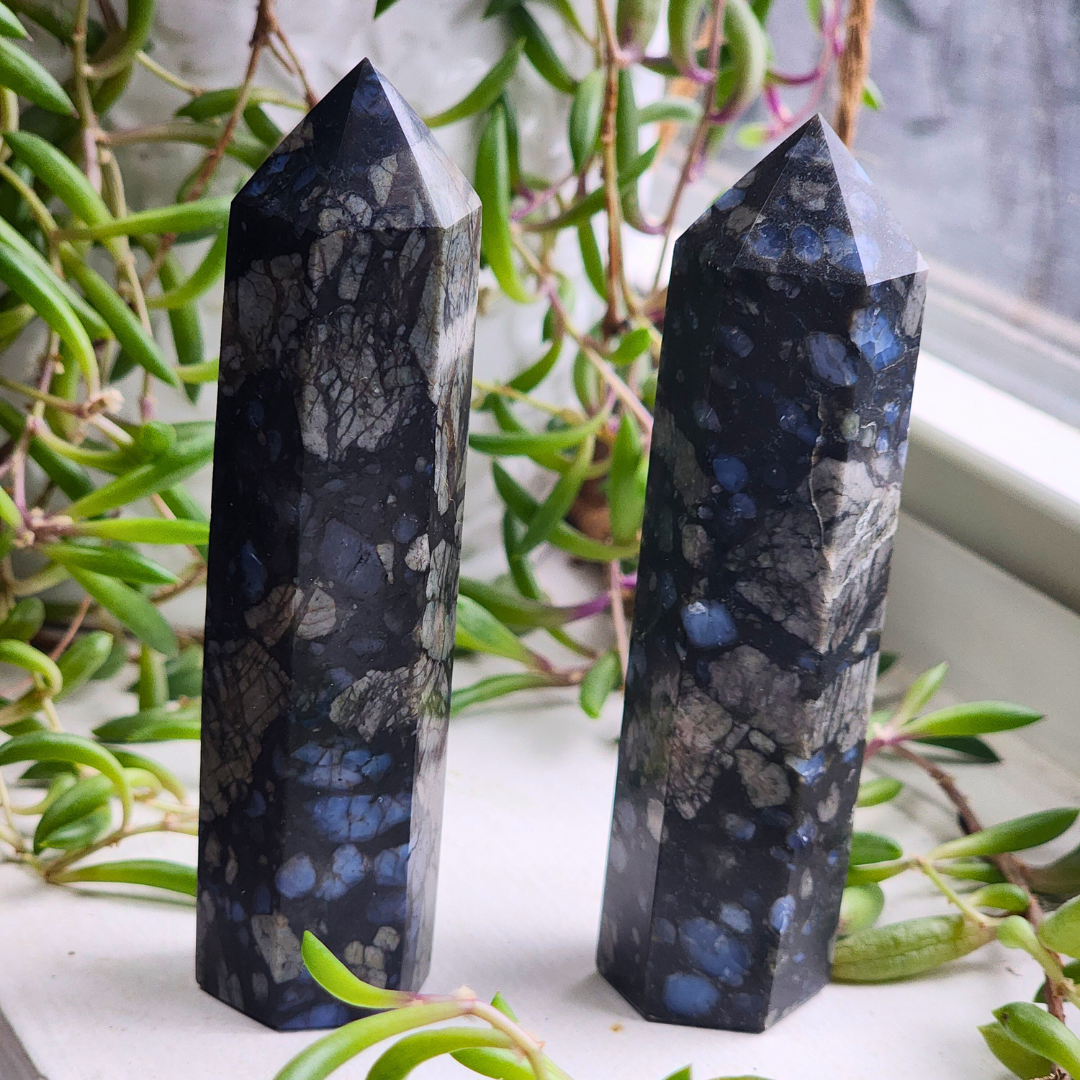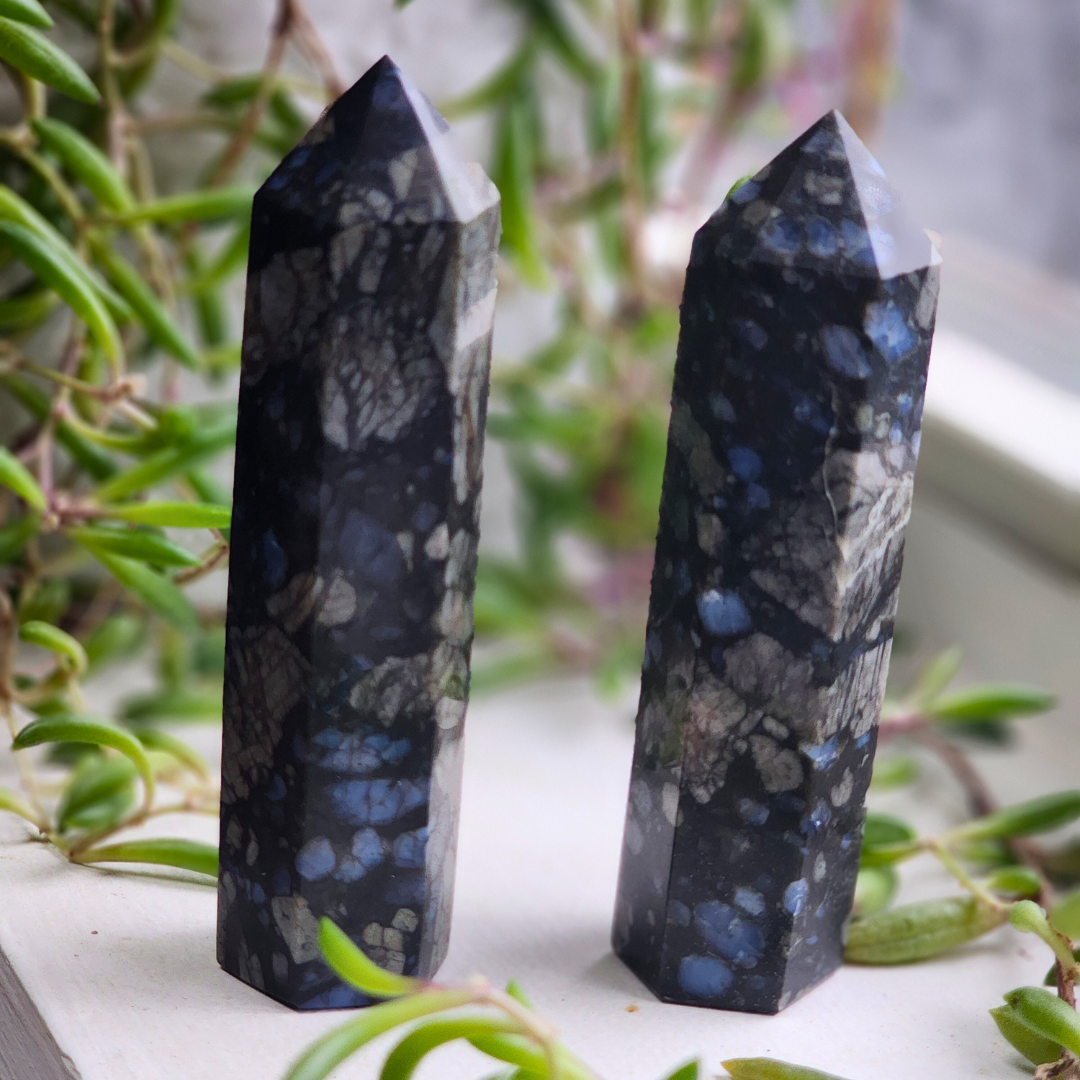 Embrace the serene energy of this Que Sera Stone Tower, standing 3.5–3.75 inches tall and weighing 83g. With its deep black base and striking patches of blue, gray, and white, this tower is both a visual masterpiece and a powerful energetic tool. Known for its uplifting and grounding properties, Que Sera Stone is perfect for those seeking clarity, balance, and peace of mind.